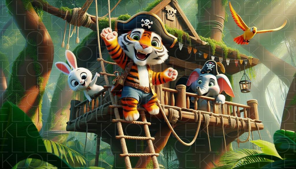 Fotobehang Kinderkamer Tijger, Olifant en Konijntje in de Boomhut | Kloelle