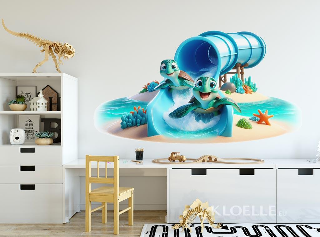 Plask! Moroa begynner på den tropiske øya! To glade havskilpadder sklir ned vannsklia med smittsom glede, omgitt av gyllen sand, klare sprut og en varm sommerhimmel. Scenen stråler av positiv energi, med fargerike detaljer og smil som bringer barneromsveggen til liv. Dette veggklistremerket for barn gjør rommet om til en magisk øy full av lek og fantasi, og skaper en frisk, morsom og visuelt tiltalende atmosfære. Et kreativt og inspirerende valg – perfekt for å tilføre farge, bevegelse og en tropisk følelse til det mest unike hjørnet i barnerommet.