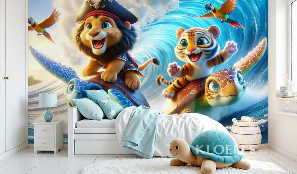 Fototapet Barnerom Løve og Tiger Surfer med Havskilpadder | Kloelle