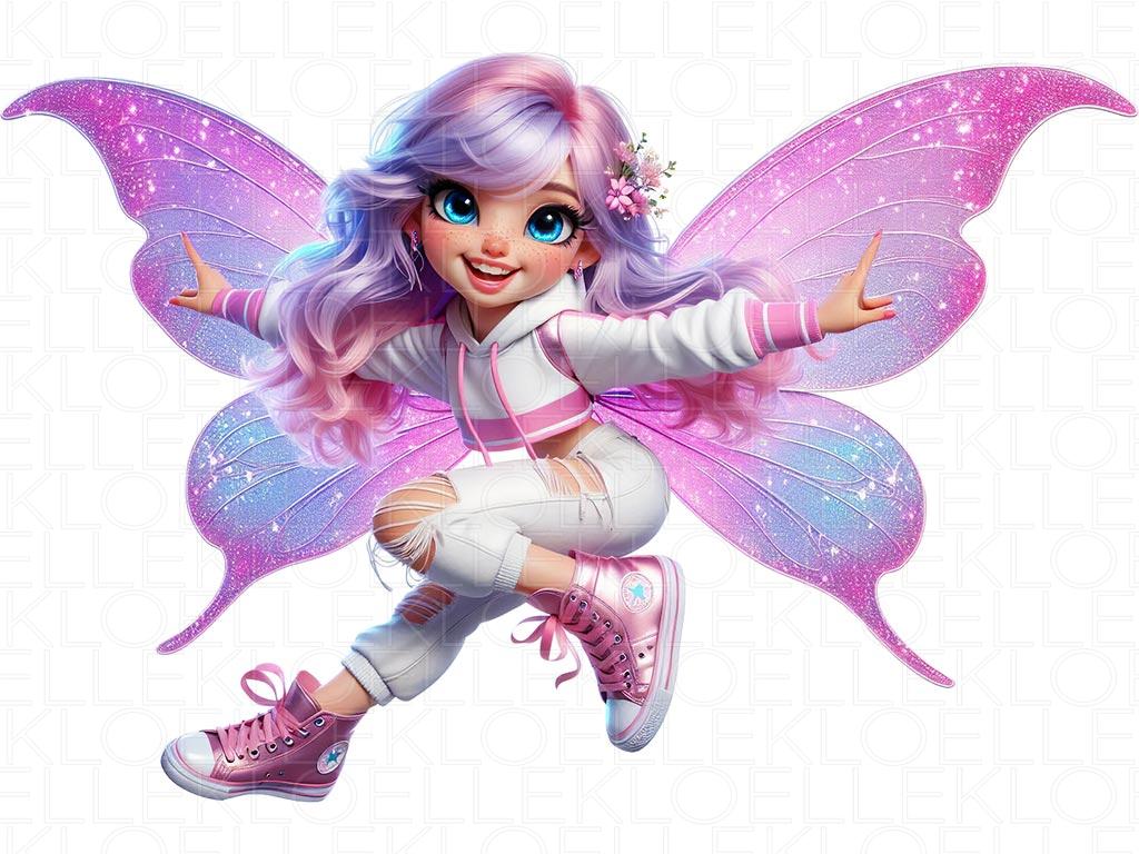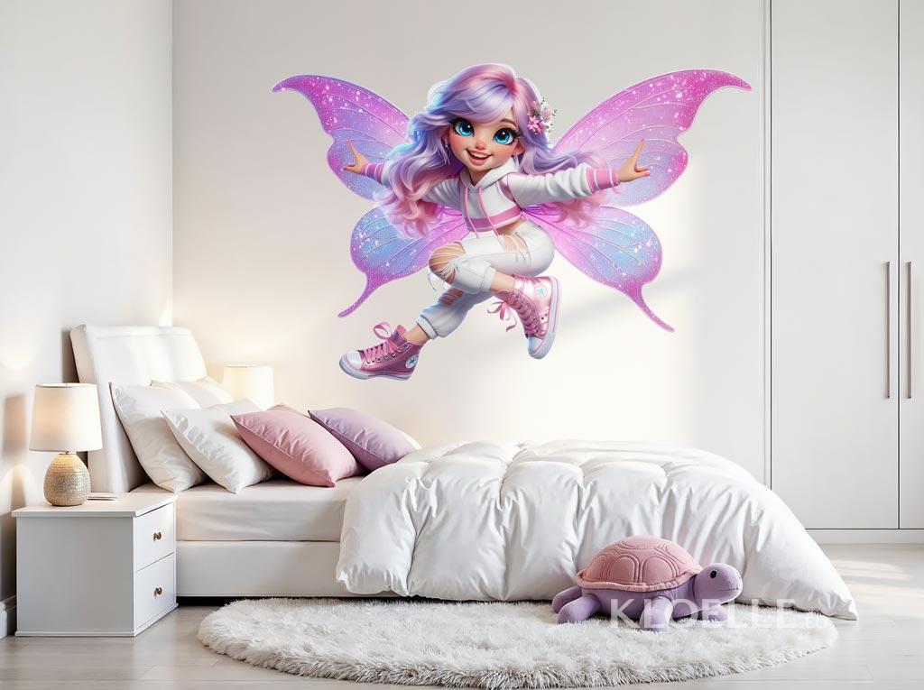 Denne vakre og smilende feen med glitrende, intens rosa vinger elsker å danse. Hun har langt, silkemykt hår i lilla og rosa og moderne satengsko i rosa. Hun beveger seg med ynde, som om hun svever i en magisk dans. Denne lille, fortryllende feen gir liv, glans og fantasi til innredningen av jenterommet, og forvandler veggen til en eventyrlig verden.