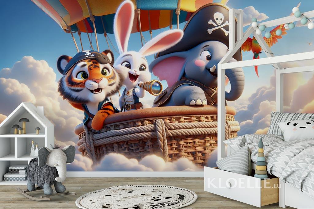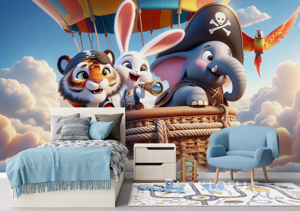 På en solrik og spennende dag gjør tre små pirater seg klare for et helt spesielt oppdrag. Den modige lille tigeren, den nysgjerrige hvite kaninen med kikkerten alltid klar, og den selvsikre elefanten med sin pirathatt – alle ombord i en praktfull luftballong i livlige farger.​ Reisen begynner med spenning og stiger høyere og høyere, til de, blant skyer myke som bomull og eventyrlige vinder, får øye på en gyllen silhuett i horisonten: den legendariske Skatteøya.​ Blant latter, oppmerksomme blikk og en kikkert alltid rettet mot horisonten, deler de et magisk eventyr i himmelen.​ For en fantastisk reise! Tenk deg et barnerom hvor dette eventyret blir virkelighet – et livlig sted fullt av glede, perfekt for små eventyrere som elsker og drømmer om piratverdenen.