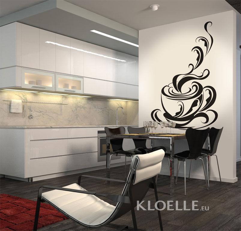 Vinil decorativo para a cozinha de uma pessoa com gostos exóticos. Aplique numa parede esta taça de café fumegante em arabescos que envolverá toda a divisão numa atmosfera de fragrâncias ricas.