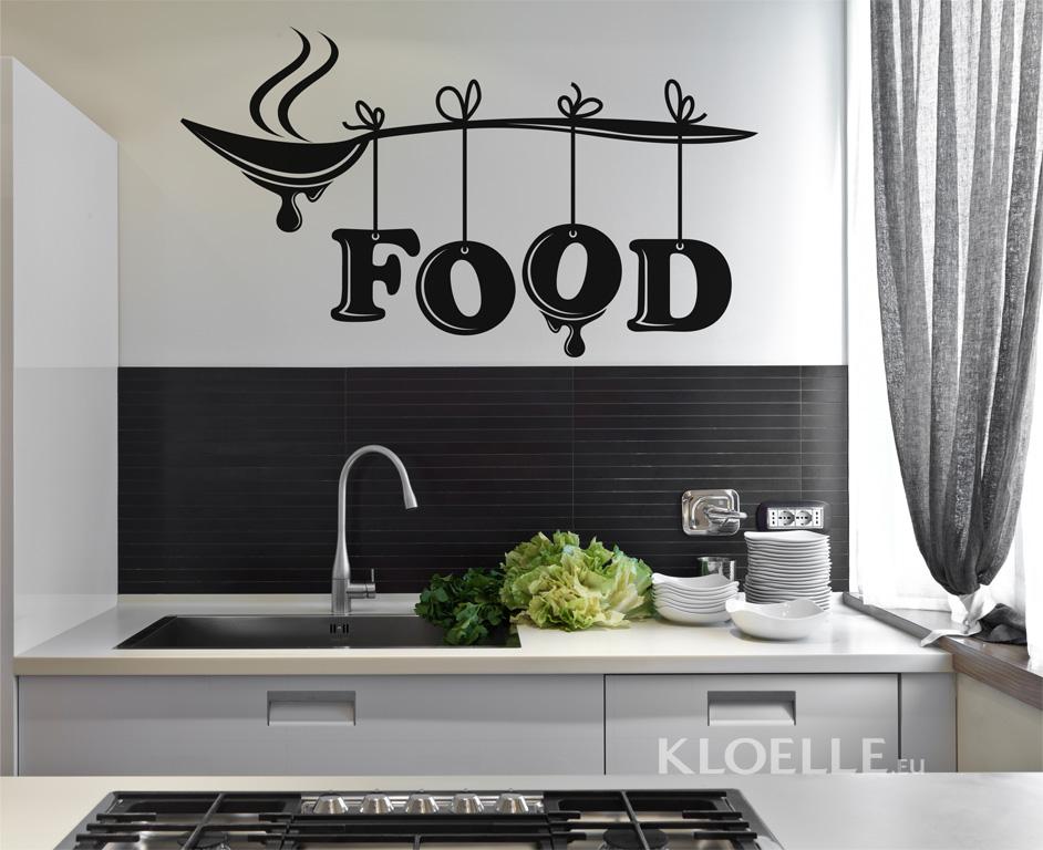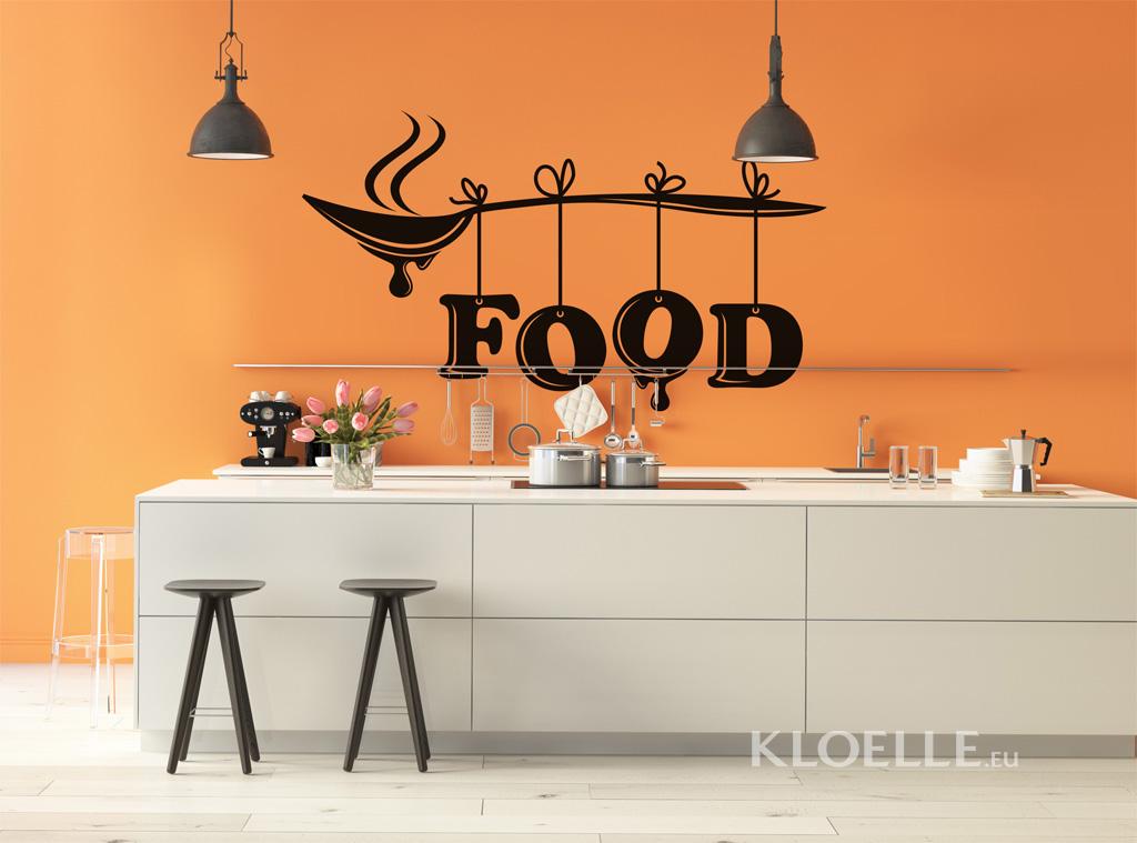 Vinil decorativo para a sua cozinha, elaborado com carinho. Este autocolante de parede apresenta-nos uma colher que, depois de escutar os lamentos longínquos de um jovem estudante com saudades da sopa de cenoura do pai, encheu a sua concha e voou à velocidade da luz até ao dormitório do rapaz com quatro letrinhas de massa agarradas à pega, que juntas formam a palavra em inglês para comida.