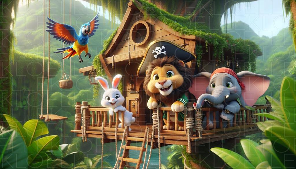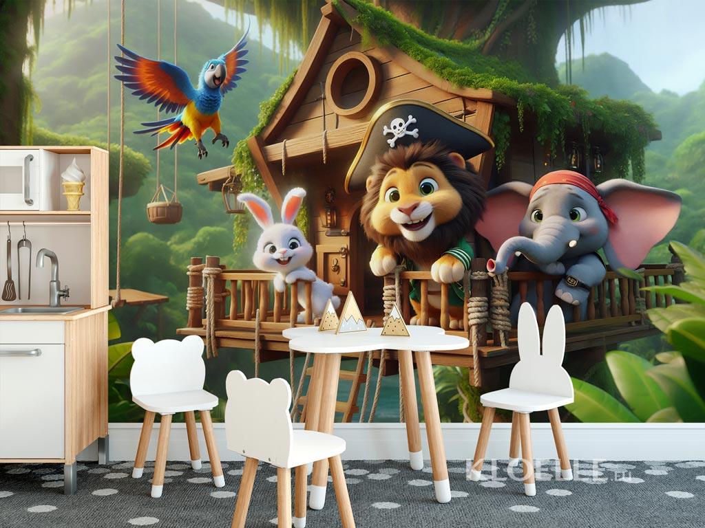 No alto de uma grande árvore, escondida no coração da selva tropical dos piratas, existe uma casa da árvore pirata. Lá vivem três amigos inseparáveis — um leão ternurento e sorridente com chapéu de pirata, um coelho branco amoroso e um elefante gentil com uma bandana de pirata. Sempre por perto, o papagaio brincalhão dá o alarme com um Ahooy! cada vez que um plano pirata está prestes a começar. Neste refúgio secreto, cada dia é de pura aventura: construir jangadas, caçar tesouros escondidos ou explorar trilhos secretos na selva tropical como verdadeiros aventureiros. Agora imagina o quarto das crianças a transformar-se neste cenário vibrante — como se, ao abrir a porta, entrassem no seu próprio esconderijo pirata. Um mural de parede para crianças que convida a embarcar em mil aventuras com piratinhas e animais da selva, num mundo cheio de magia e descoberta.
