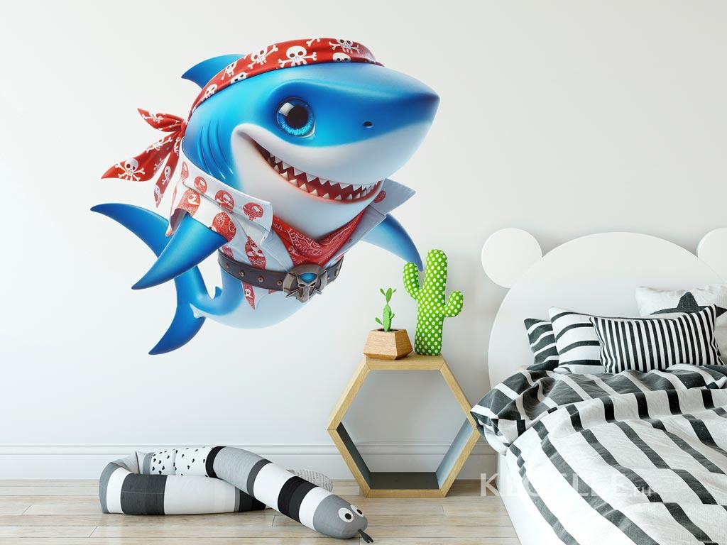Autocolantes de Parede Infantil Tubarão Azul com Traje de Pirata | Kloelle