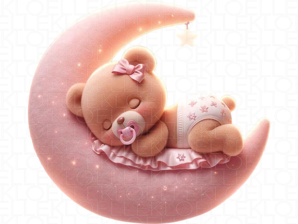 Num quartinho cheio de encanto, uma ursinha de peluche adormece feliz sobre a sua lua rosa cintilante. A lua, fofa como uma nuvem, envolve-a num brilho delicado com pequenas estrelinhas a brilhar em silêncio. A ursinha repousa tranquila, aconchegada nas curvas da lua, com o seu sorriso sereno. O quarto enche-se de ternura, como se o tempo parasse para guardar aquele instante. Um cenário terno e mágico — ideal para levar calor, brilho e fantasia à decoração do quarto de bebés e meninas.