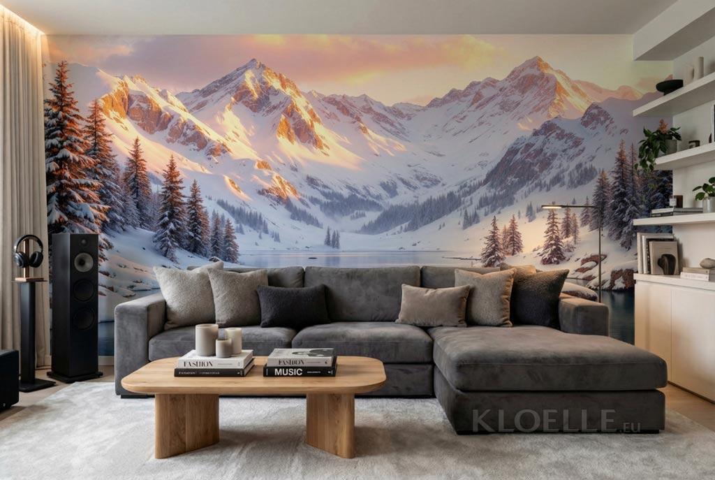 Snöklädda Berg med Alpin Sjö och Tallar